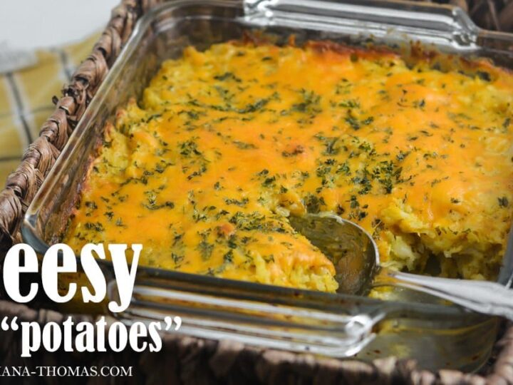 "The final Cheesy Party “Potatoes” recipe is yummy and garlicky with a surprising combination of non-starchy veggies that provide a taste and texture closer to hashbrown potatoes than anything I’ve tried before! They are NOT potatoes and therefore will not taste exactly like potatoes, but they do make a delicious and nutritious cheesy side dish that would be the perfect addition to your Thanksgiving or Christmas dinner,"