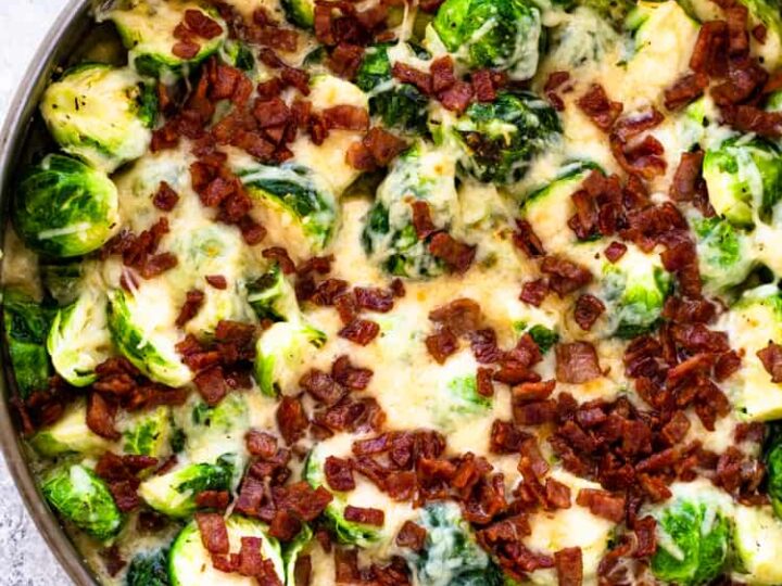"Tender Brussels sprouts cooked in a creamy garlic parmesan sauce and topped with crispy bacon making this a perfect Thanksgiving side dish or a complete low carb keto meal."