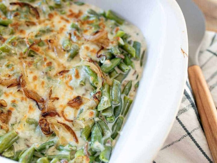 "This healthy low carb Keto Green Bean Casserole is exactly what you need for your holiday meals. Creamy mushroom sauce and crunchy onion topping will remind you of the traditional green bean casserole with condensed soup and fried onion topping. But this one is better for you AND tastes better."