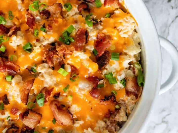 "The original Loaded Cauliflower Casserole! This recipe combines all delicious flavors of a twice baked potato, but in a keto-friendly version. With tender cauliflower cooked in chicken stock, cheeses, garlic, crispy bacon, sour cream and fresh green onions, this is the ultimate low carb comfort food."