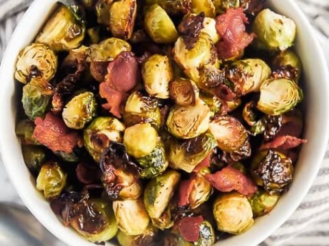 "One of my favorite low carb side dishes is Brussel Sprouts with Bacon! With only 4 ingredients, these oven roasted Brussels sprouts with bacon are delicious!"