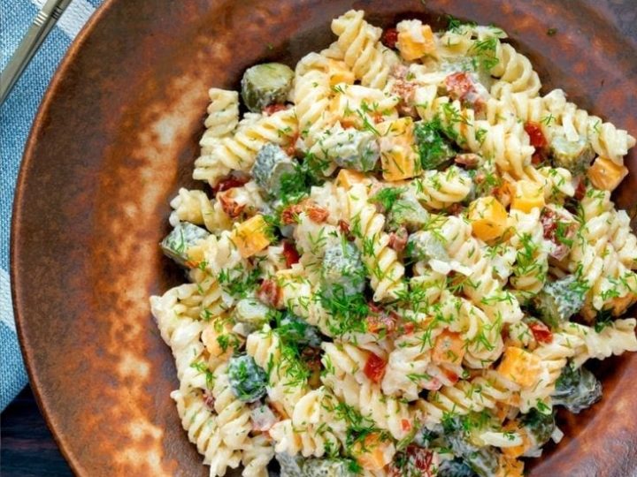 Dill pickle pasta salad is a creamy, simple recipe that is the perfect make ahead meal or side.