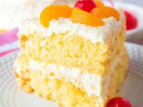 Pig pickin’ cake is a traditional southern dessert made with rich yellow cake laced with whole mandarin oranges and topped with a creamy pineapple frosting.