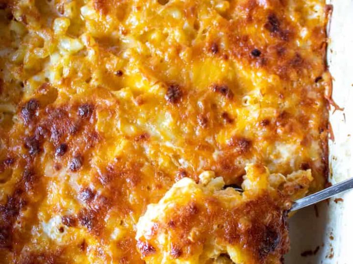 Creamy baked southern-style macaroni and cheese, a cheesy baked casserole and soul food classic