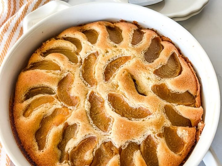 Peach Cobbler Pound Cake is dense, rich, and topped with sweet peaches.