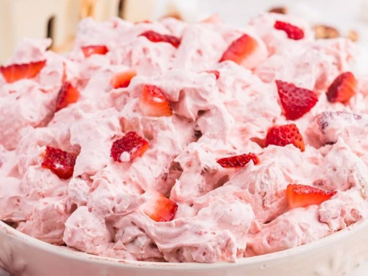 This Strawberry fluff salad recipe is an easy dessert salad made with strawberry pie filling, pineapple chunks, Cool Whip, mini marshmallows, and a few other simple ingredients.