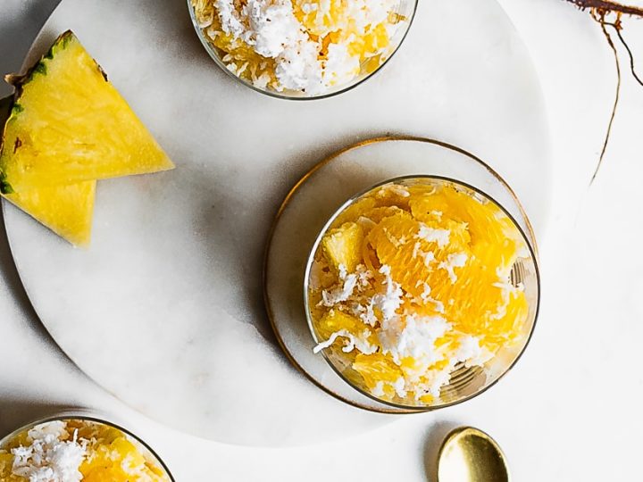 This Fresh Ambrosia Salad recipe features only the simplest ingredients: fresh oranges, pineapple, and coconut with a hint of sugar.