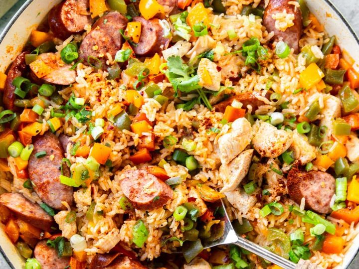 This quick and easy Chicken Jambalaya Recipe is the ultimate one-pot recipe! It’s ready to eat in 30 minutes and chock full of chicken, andouille sausage, rice, veggies, and Cajun seasonings.