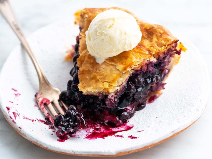 This easy recipe for blueberry pie with frozen blueberries has a sweet, fruity filling and a homemade flaky all-butter crust. No runny pie filling here!