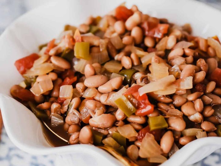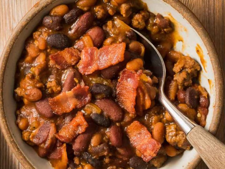 These Texas style baked bean are an excellent side dish that can also serve as a great dinner. Smoked sausage, chili powder, and jalapeño adds tons of flavor!