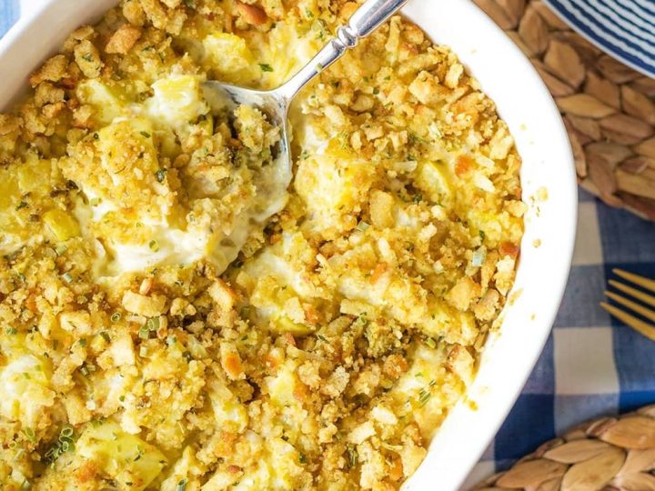 Yellow squash and onions in a creamy casserole topped with stuffing is a classic Southern potluck staple!